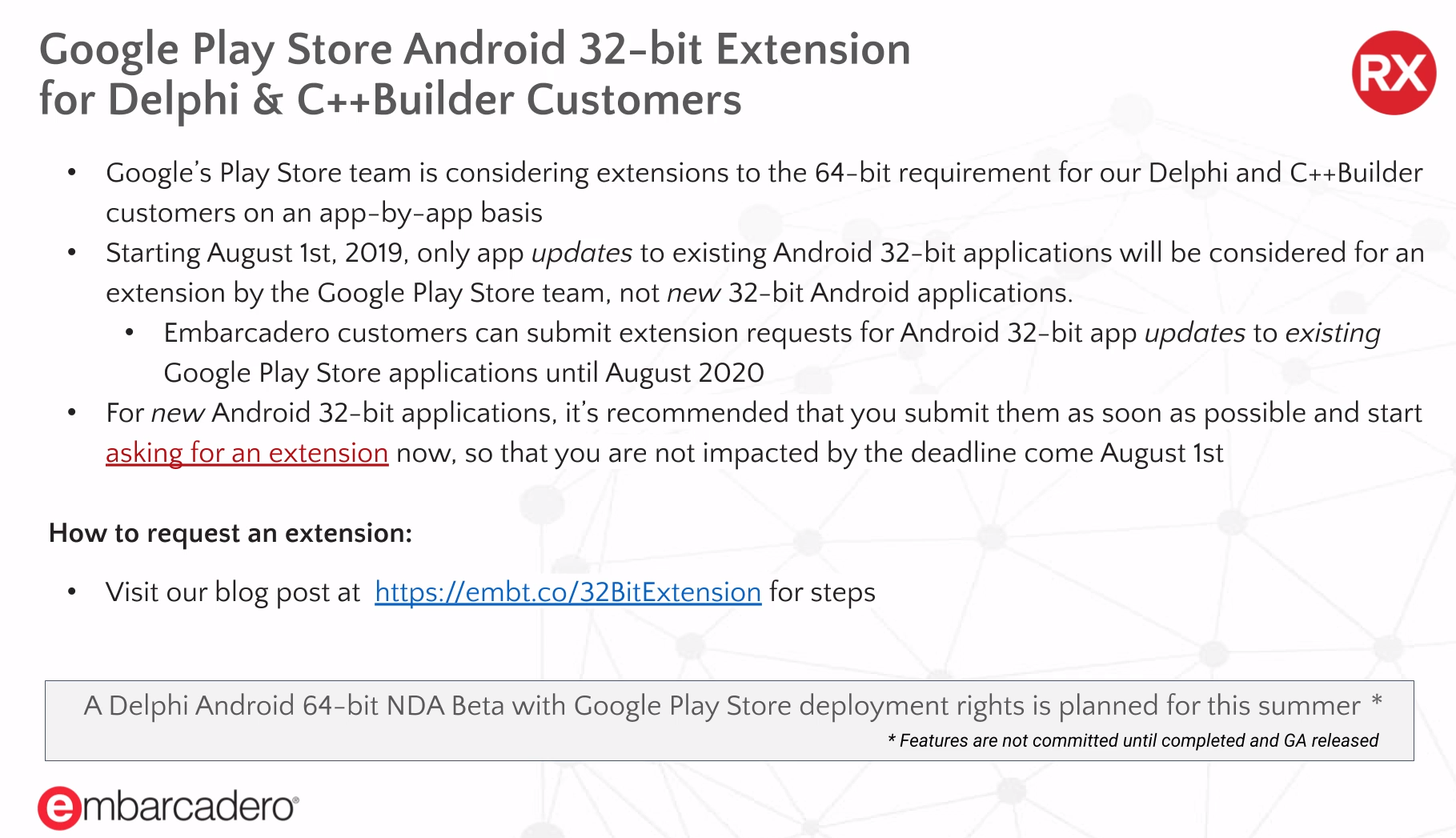 * Embarcadero customers can submit extension requests for Android 32-bit app updates to existing Google Play Store applications until August 2020.