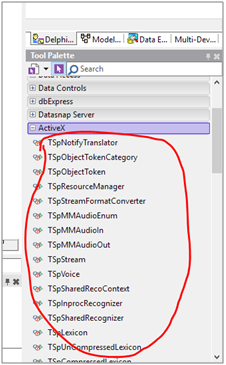 11. 이제 델파이의 컴포넌트 팔레트에 보면 "TSp"로 시작하는 SAPI 컴포넌트가 다수 보일 것이다.