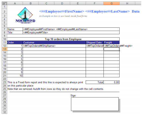 여기서 TopOrders에 1 개, 2 개 또는 10 개 (10 개를 초과해서는 안 됨)의 레코드가 있더라도 "Total"행은 23 행에 있습니다. 행을 삽입하므로 일반 범위에서는이 작업을 수행 할 수 없습니다. 이를 위해 FlexCelReport 컴포넌트의“ReportModeRows”속성을“frm_DontCopyAndDontInsert”로 설정할 수 있습니다.