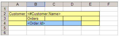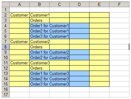 다음 예에서 노란색 셀은 "__Customer__"범위이고 파란색 셀은 "__Orders__"범위입니다.
