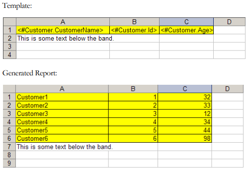 이제“Band”라는 개념을 소개하겠습니다. 밴드는 테이블의 각 레코드에 대해 반복되는 셀 범위 일뿐입니다 .A1 : C1 셀 범위에서 밴드를 정의하고 테이블과 연결한다고 상상해보십시오. "고객": 그런 다음 셀 A1 : C1에서 첫 번째 고객, 셀 A2 : C2에서 두 번째 등을 갖게됩니다. 이전에 A2 : C2에 있었던 모든 셀은 데이터 세트의 마지막 레코드 후에 아래로 이동합니다.