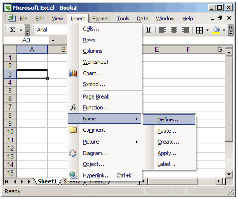 A1 : C1에 밴드를 만들려면 메뉴-> 삽입-> 이름-> 정의로 이동하십시오.