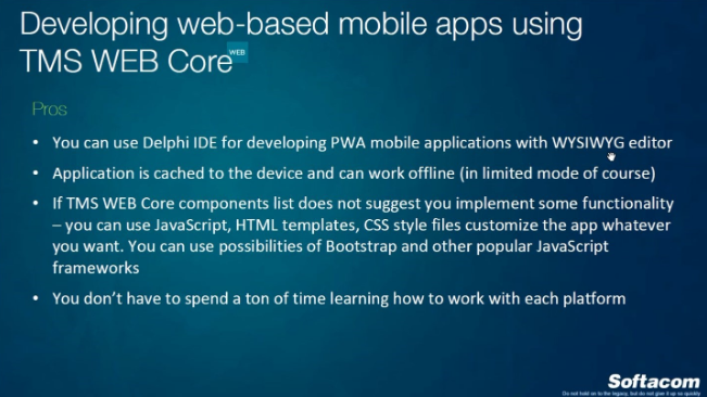 Which pros do we have? You can use Delphi IDE for developing progressive web mobile applications using what-you-see-is-what-you-get (WYSIWYG) editor. Later on the next slides I will show you an example how it looks like in the IDE designer and in the real browser. Application is cached to the device and can work offline (in limited mode). If TMS WEB Core components list does not suggest you implement some functionality you can use JavaScript, HTML templates, CSS style files and customize your app whatever you want. TMS WEB Core project supports this possibility. You can use possibilities of Bootstrap and other popular JavaScript frameworks for developing your application. You really don't have to spend a ton of time learning how to work with each platform because it's really one applications with the same UI for different platforms.