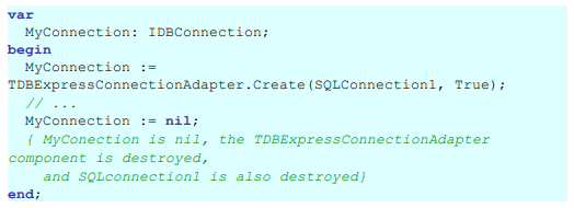 Create 생성자를 호출 할 때 두 번째 매개 변수를 확인하십시오. IDBConnection 인터페이스가 소멸되면 래핑 된 TSQLConnection 구성 요소도 파괴된다는 것을 나타냅니다.