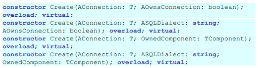 어댑터의 Create 생성자에서 두 번째 부울 매개 변수를 확인하십시오. IDBConnection 인터페이스가 소멸 될 때 기본 연결 구성 요소가 파괴되는지 여부를 나타냅니다. 이 방법은 TMS Aurelius에서 빌려 왔지만 RemoteDB의 경우 IDBConnection 인터페이스가 해제 된 후에는 구성 요소를 활성 상태로 유지하면 안됩니다. 인터페이스를 사용하여 항상 구성 요소를 삭제하십시오 (매개 변수는 true 여야 함). 위의 예제 ( "어댑터 만들기")에서 MyConnection 인터페이스가 범위를 벗어나서 해제 된 후 SQLConnection1 구성 요소가 삭제됩니다. 아래의 간단한 예 :