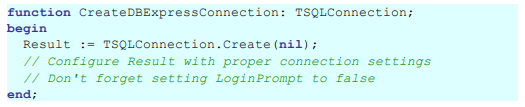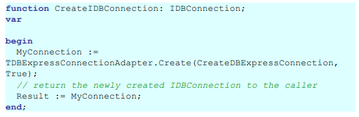 예를 들어 dbExpress를 사용하는 경우 TSQLConnection 구성 요소를 만들어 랩핑하는 어댑터를 만들어야합니다.