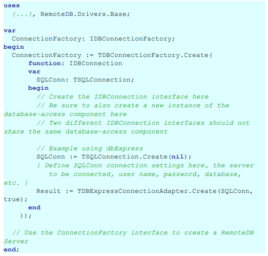 이전 코드는 데이터 모듈 TConnectionDataModule의 새 인스턴스를 만든 다음 데이터 모듈에있는 SQLConnection1 구성 요소를 적용하여 IDBConnection을 만듭니다. MyConnection이 해제되면 데이터 모듈 (MyDataModule)이 삭제되고 SQLConnection1 구성 요소도 함께 삭제됩니다. 이는 디자인 타임에 연결 설정을 설정하거나 데이터베이스 액세스 구성 요소가 이미 올바르게 구성되어있는 기존 TDataModule을 가지고있는 경우에 유용합니다. 그런 다음 위의 코드를 RemoteDB 서버에서 사용하여 데이터 모듈의 각 인스턴스에 대해 하나의 IDBConnection을 만듭니다.