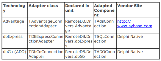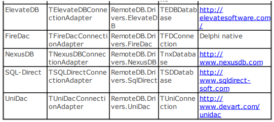 각 데이터 액세스 구성 요소에 대한 어댑터가 있습니다. 예를 들어 dbExpress의 경우 RemoteDB.Drivers.dbExpress 단위로 선언 된 TDBExpressConnectionAdapter가 있습니다.