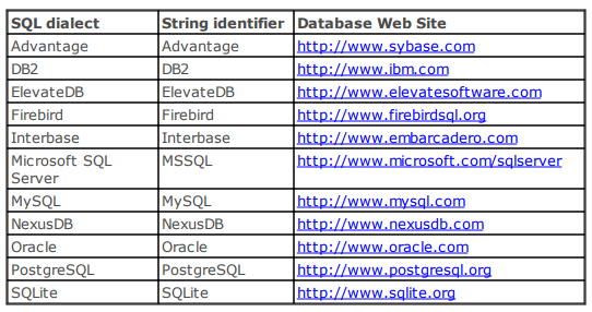 다음 표에는이 경우 사용할 수있는 유효한 SQL Dialect 문자열이 나열되어 있습니다.